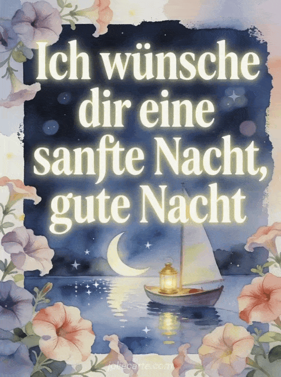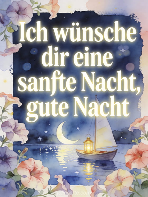 Sende eine ruhige Gute-Nacht-Nachricht mit elfenbeinfarbener Schrift, Petunien, einem kleinen Segelboot mit goldener Laterne auf einem stillen See unter einer Mondsichel. Entdecke auch eine Gute-Nacht-Nachricht für eine Freundin, eine eine kleine Gute-Nacht-Nachricht oder eine romantische Gute-Nacht-Nachricht.
