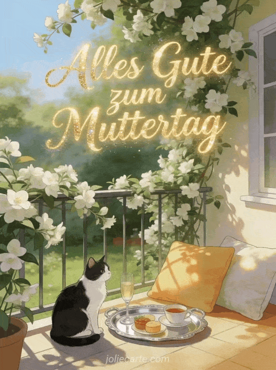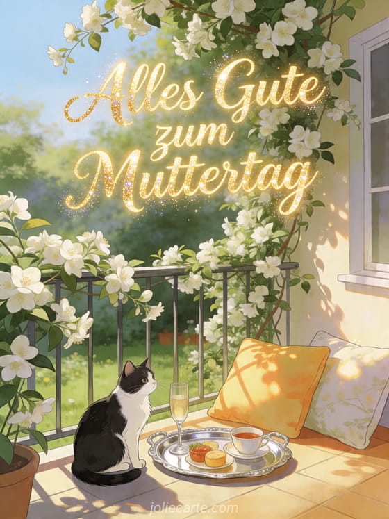 Teile eine Zeichnung zum Muttertag mit leuchtender Champagnerschrift, sanftem Glitzer und einem mit Jasmin bewachsenen Balkon. Eine schwarz-weiße Katze sitzt neben einem silbernen Frühstückstablett und sonnigen Gartenkissen, wodurch eine herzliche Karte entsteht. Entdecke auch liebe Worte zum Muttertag, Alles Gute zum Muttertag Karte oder Muttertag Fotografien.