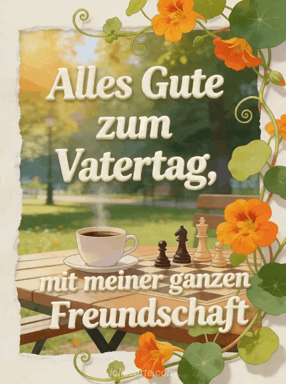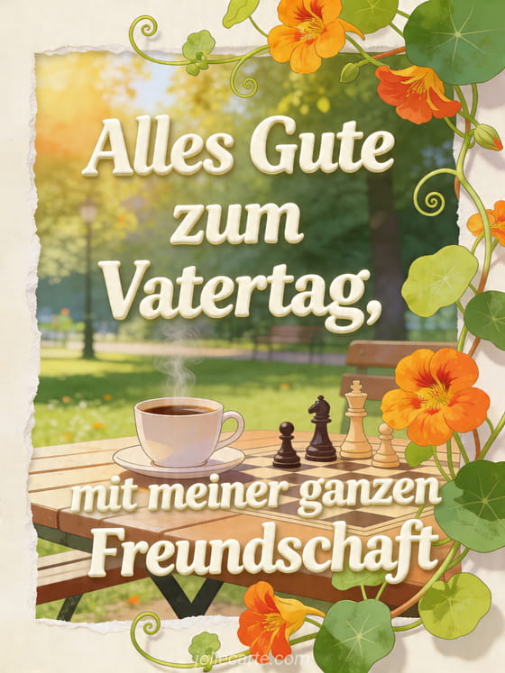 Teile eine freundliche illustrierte Vatertagskarte mit einem sonnigen Parktisch, dampfender Kaffeetasse, Schachfiguren und leuchtender Kapuzinerkresse, die über den Bildrand ragt. So sendest du Freundschaft und gute Wünsche auf warme Weise. Entdecke auch ein originelles Vatertags-GIF, mein Schatz mein Liebling alles Gute zum Vatertag oder eine personalisierte Vatertagskarte.