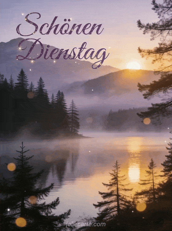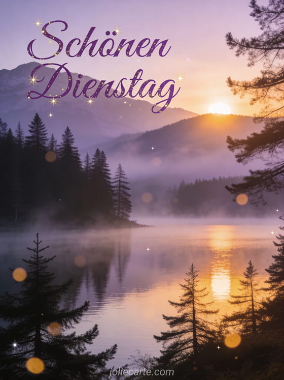 Sende einen ruhigen Gruß für einen schönen Dienstag mit goldenem Sonnenaufgang über einem nebligen Bergsee und eleganter violetter Schrift. Entdecke auch eine Schönen Dienstag und schönen Tag GIF, eine schönen dienstag küsschen bilder oder eine schönen dienstag schönen tag gif.