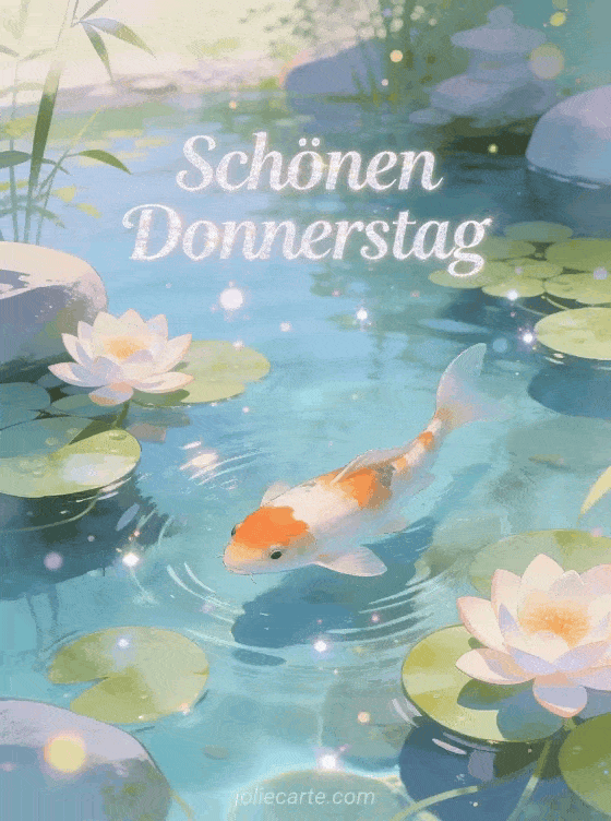 Verbreite Zen-Donnerstags-Vibes mit diesem ruhigen Koi-Teich-Gruß. Entdecke auch eine Karte kostenlose Bilder schöner Donnerstag Küsschen oder eine Karte guten Donnerstag Herz.