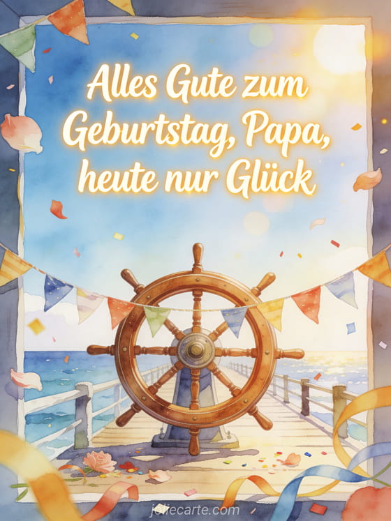 Teile einfach alles gute zum geburtstag papa mit einem Schiffsrad, das von Geburtstagswimpeln auf einem sonnigen Pier umgeben ist, in hellem Aquarelllicht am Meer. Dazu passen alles gute zum geburtstag papa herz, alles gute zum geburtstag papa auto oder alles gute zum geburtstag papa kalligrafie.