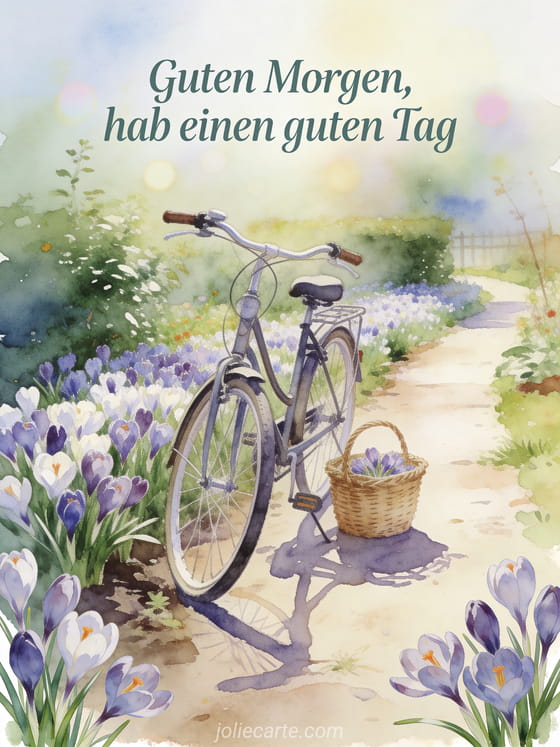 Verschicke eine fröhliche Karte mit einem Vintage-Fahrrad, das an einem Gartenweg voller frischer Krokusse und einem kleinen Weidenkorb lehnt. Entdecke auch eine Guten Morgen Liebling Nachricht, hübsche Guten Morgen Karten oder eine Guten Morgen Nachricht an seine Freundin.