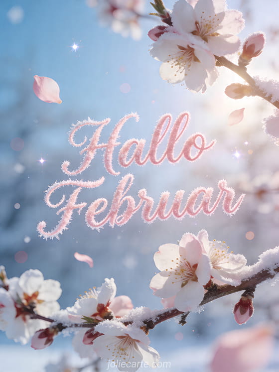 Teilen Sie diese zarte Karte Hallo Februar mit Mandelblüten, rosafarbenen Blütenblättern und sanftem Winterlicht. Entdecken Sie auch sms hallo am morgen, hallo am morgen und sag hallo.