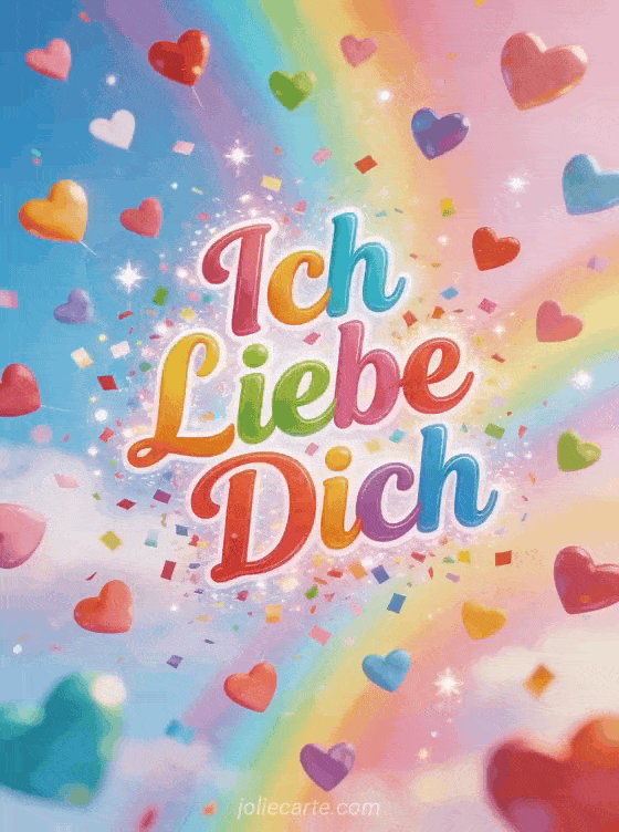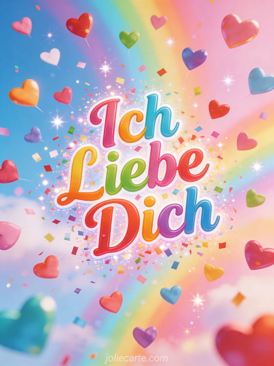 Senden Sie diese fröhliche Grußkarte mit einem Regen bunter Herzen, die vom Himmel fallen, auf einem leuchtenden pastellfarbenen Regenbogenhintergrund. Entdecken Sie auch eine Karte ich liebe dich auch oder eine Karte ich liebe dich unendlich.