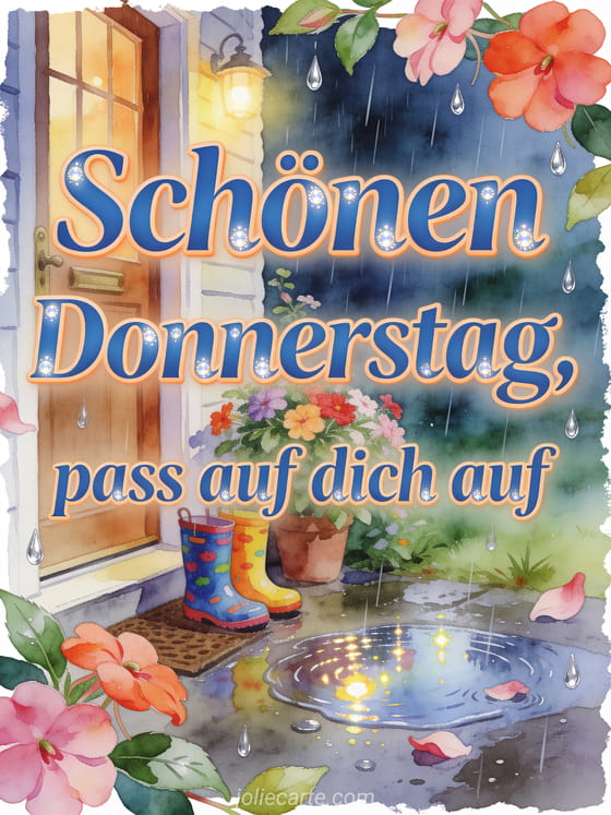 Teile eine fürsorgliche Karte für einen schönen Donnerstag mit einer regnerischen Haustür, bunten Gummistiefeln, blühendem Fleißigem Lieschen und glänzenden Pfützen. Du kannst auch angenehmer Donnerstag Küsschen, schöne Bilder für schönen Donnerstag oder ein sonniges Schönen-Donnerstag-Bild senden.