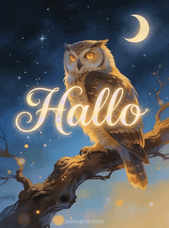 Sage Hallo mit dieser zauberhaften Eulen-Karte. Entdecke auch eine Hallo-kleiner-Wellensittich-gif-Karte oder eine kleines-Hallo-Küsschen-Karte.