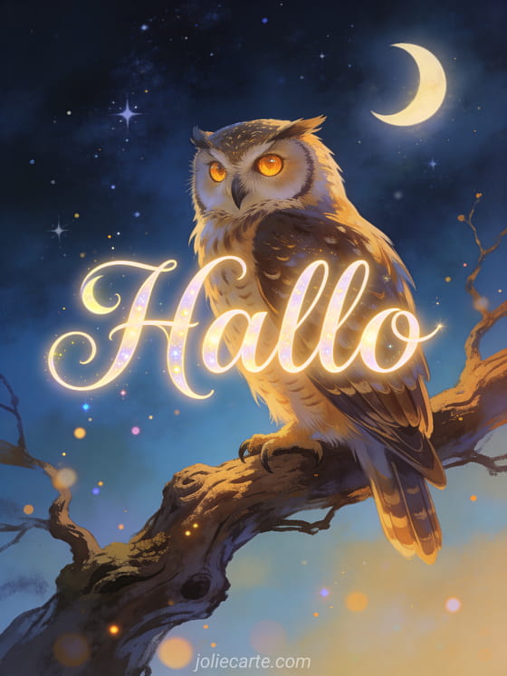 Eule Hallo ein bezauberndes Hallo von einer weisen Eule unter dem Sternenhimmel
