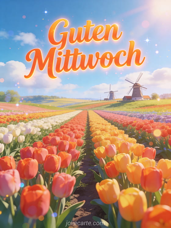 Teile einen fröhlichen sonnigen Mittwoch mit dieser bunten holländischen Tulpenfeld-Karte. Entdecke auch eine Karte Mittwoch im Regen oder eine Karte Mittwoch Pferde.