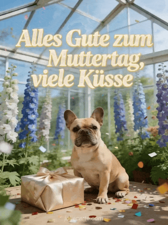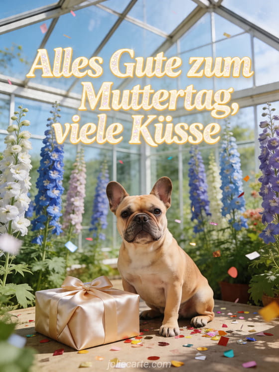 Teile ein Foto zum Muttertag mit warmen cremefarbenen Buchstaben, dezentem Glitzer und einem hellen Gewächshaus voller hohem Rittersporn. Eine Französische Bulldogge sitzt neben einem Satingeschenk und verstreutem Konfetti in dieser fröhlichen Karte. Entdecke auch Worte zum Muttertag, liebevolle Worte zum Muttertag oder Muttertagsgedicht.