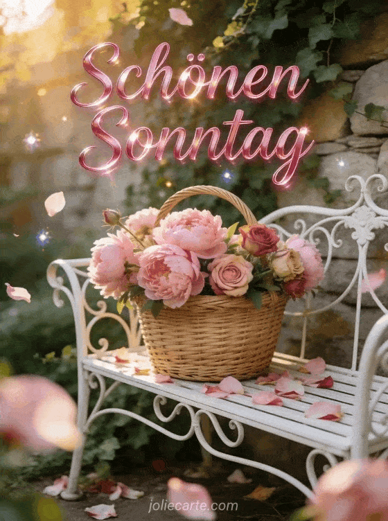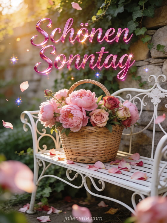 Wünsche einen schönen Sonntag mit dieser romantischen fotorealistischen Karte mit rosa Pfingstrosen und antiken Rosen in einem Weidenkorb im goldenen Abendlicht. Entdecke auch schönen sonntag gemütlichkeit oder guten morgen sonntag gif.