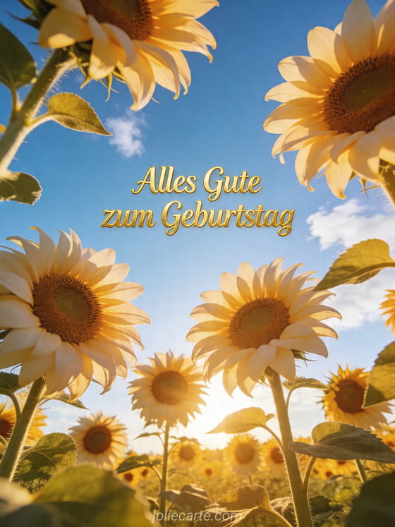 Teile ein sonniges Alles Gute zum Geburtstag mit dieser fotorealistischen Karte mit leuchtendem Sonnenblumenfeld unter blauem Sommerhimmel. Entdecke auch Geburtstag Frau humorvoll, karte alles gute zum geburtstag frau oder Blume alles Gute zum Geburtstag Frau.