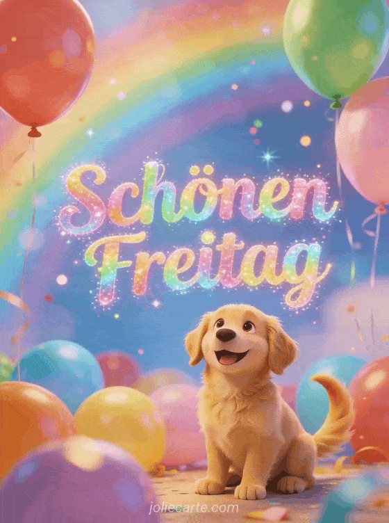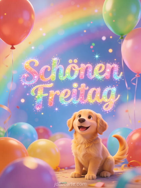 Freitag gif ein festliches und fröhliches Freitag-Gif mit einem entzückenden Golden Retriever Welpen zwischen bunten Ballons