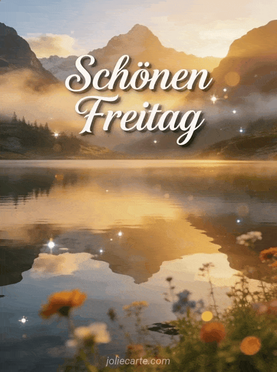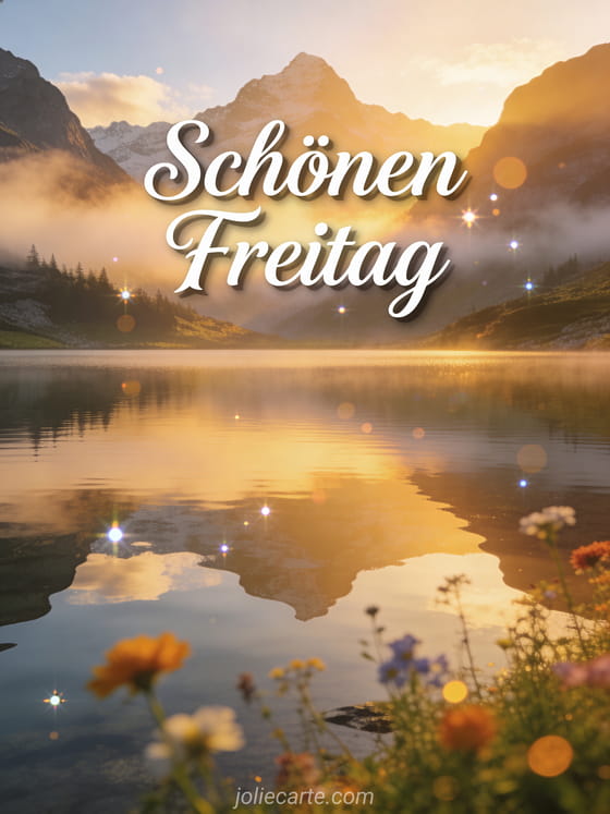 Teile einen friedlichen Spruch zum schönen Freitag mit einem gelassenen Bergsee bei Sonnenaufgang, Spiegelungen, Wildblumen und nebligen Gipfeln. Entdecke auch Schönen Freitag kostenlose Bilder, eine Nachricht zum Wünschen eines schönen Freitags oder Schönen Freitag viele Küsse.