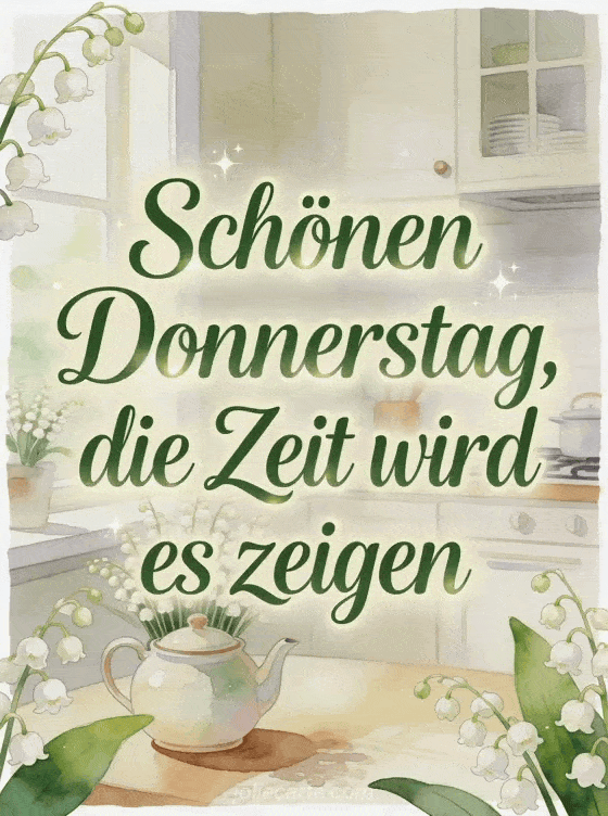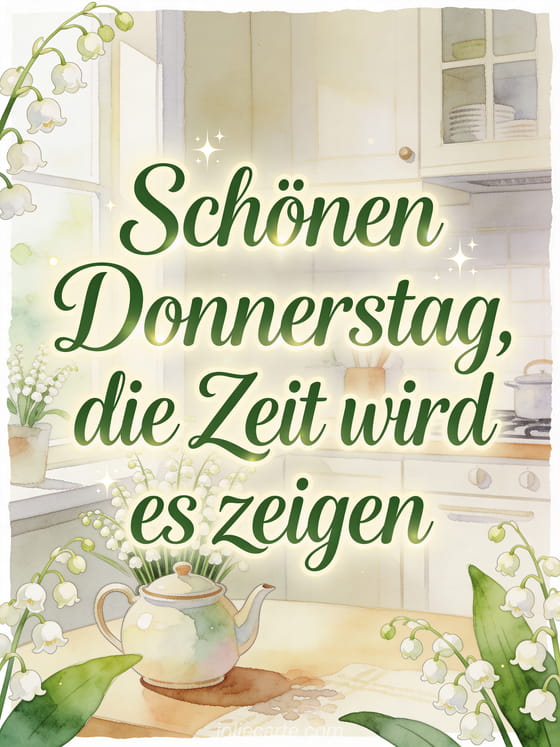 Sende schönen Donnerstag, die Zeit wird es zeigen mit waldgrüner Schrift, einer gemütlichen Teekanne, Maiglöckchen und einer hellen Küchenecke mit warmem Licht. Entdecke auch Schönen Donnerstag Zen Zitat, schönen donnerstag text oder Schönen Donnerstag meine Freunde Bilder.