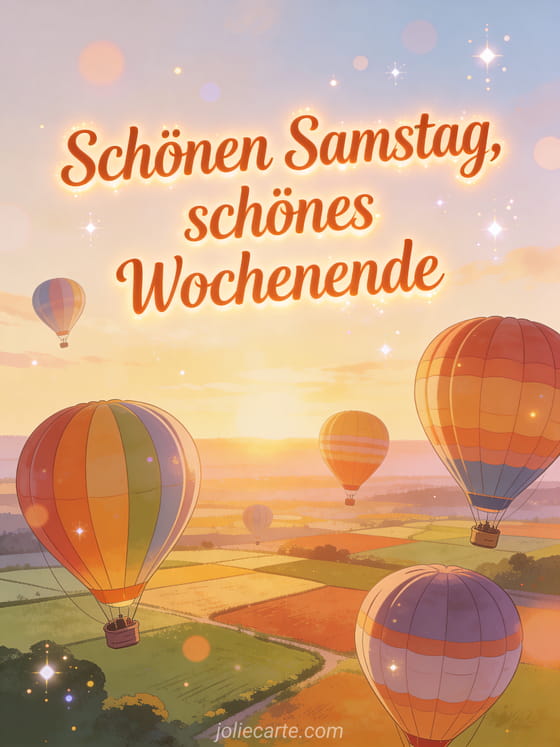 Teile einen warmen Gruß zum schönen Samstag und Wochenende mit bunten Heißluftballons, die bei Sonnenaufgang über Landschaft und Felder schweben. Entdecke auch guten Morgen schönen Samstag Küsse, Landschaft schönen Samstag Landschaft oder lustiger schöner Samstag.