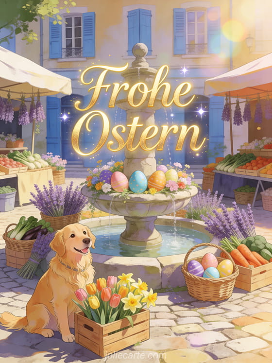 Frohe Ostern Bilder ein sonniger provenzalischer Marktplatz mit Ostereiern und einem Golden Retriever