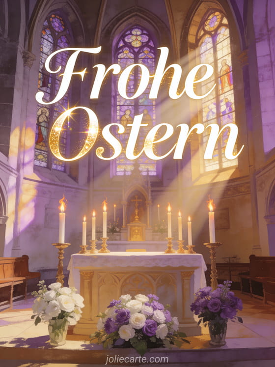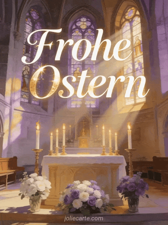 Teilen Sie eine wunderschöne christliche Frohe-Ostern-Karte mit einer Kirche voller göttlichem Glasfensterlicht und brennenden Kerzen. Entdecken Sie auch religiöse Ostern oder Auferstehung Ostern.