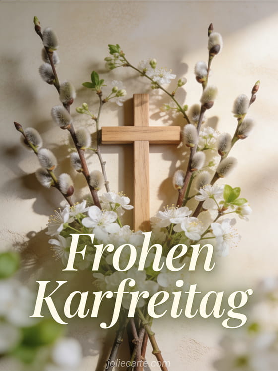 Teilen Sie einen Karfreitagsgruß mit dieser besinnlichen Karte mit einem Holzkreuz, Weidenzweigen und weißen Blumen im sanften Frühlingslicht. Entdecken Sie auch eine Ostermontag-Morgenkarte, Osterwochenende-Karte oder Osterwochenende-Grüße.