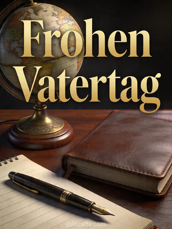 Senden Sie einen eleganten Gruß zum Vatertag mit einem alten Messingglobus auf einem Mahagonischreibtisch, neben einem Füllfederhalter und einem Ledernotizbuch. Entdecken Sie auch ein alles Gute zum Vatertag Papa kostenloses Bild, eine Vatertagskarte online oder Vatertag Blumen.