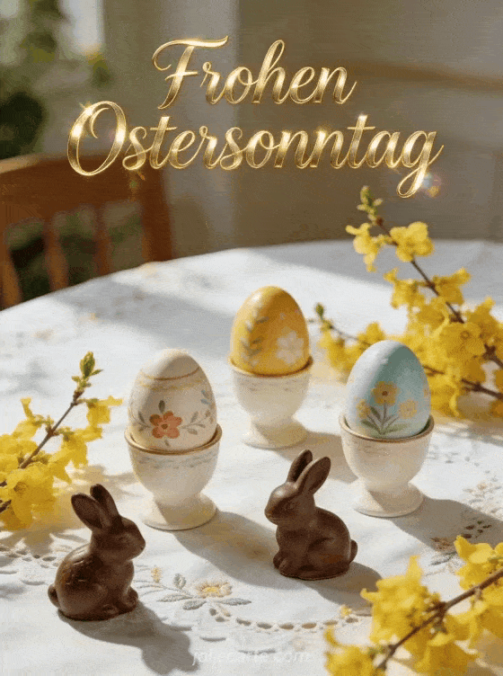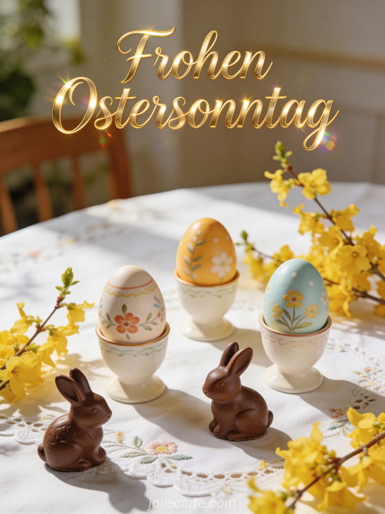 Feiern Sie den Ostersonntag mit dieser herzlichen Karte mit einem festlich gedeckten Tisch, handbemalten Eiern, Schokohasen und Forsythienzweigen im goldenen Morgenlicht. Entdecken Sie auch eine Ostermontag-Karte, Osterwochenende-Karte oder Osterwochenende-Grüße.