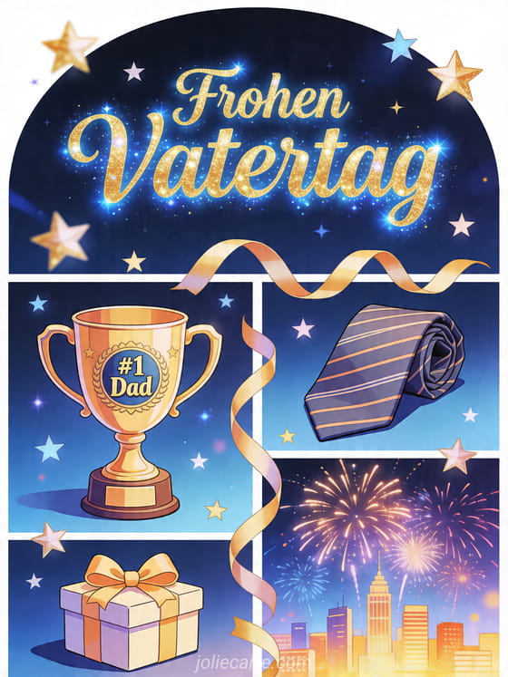 Feiere Papa mit einer lebendigen illustrierten Vatertagskarte mit Trophäentasse, gefalteter Krawatte, Geschenkbox und heller Stadt unter Feuerwerk. Dieses festliche Motiv bringt Energie und Freude in den Tag. Entdecke auch eine Vatertagskarte Krawatte, Alles Gute Papa Vatertagskarte oder Vatertag liebe Worte.