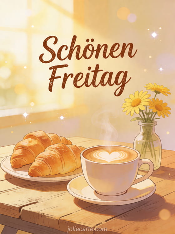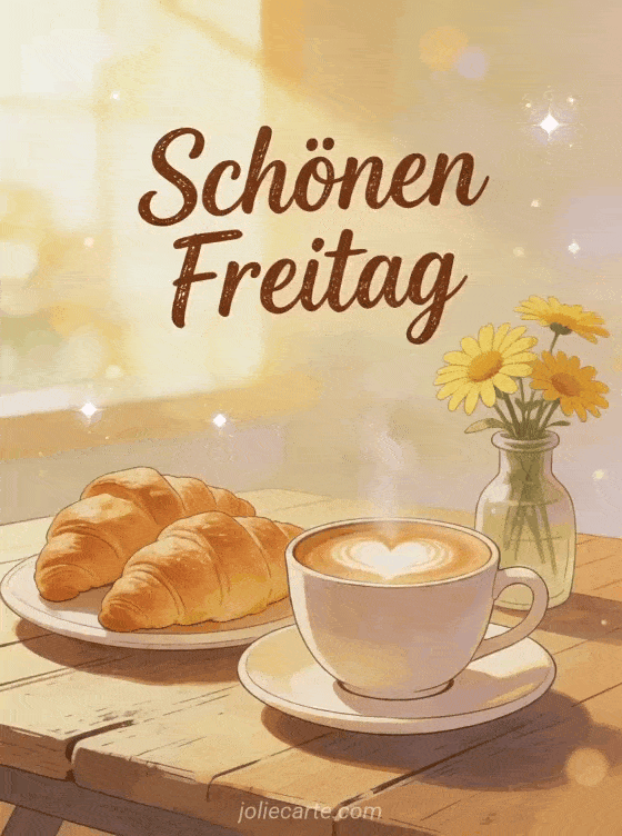 Beginne den Freitag mit Wärme dank dieser einladenden Karte mit dampfendem Cappuccino, goldenen Croissants und gelben Margeriten auf einem rustikalen Frühstückstisch. Entdecke auch guten morgen schönen freitag schönen tag, schönen freitag katze oder guten morgen es ist freitag gif.