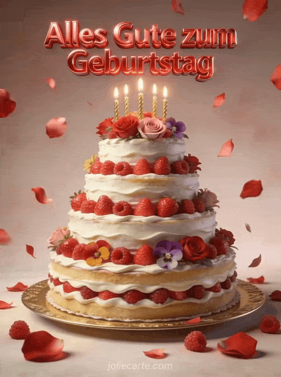 Feiere mit einer animierten Geburtstagskarte mit spektakulärer fünfstöckiger Torte, roten Früchten und goldenen Kerzen. Entdecke auch geburtstag animierte bilder, geburtstagskarte junge kostenlos animiert und virtuelle animierte Geburtstagskarte kostenlos.