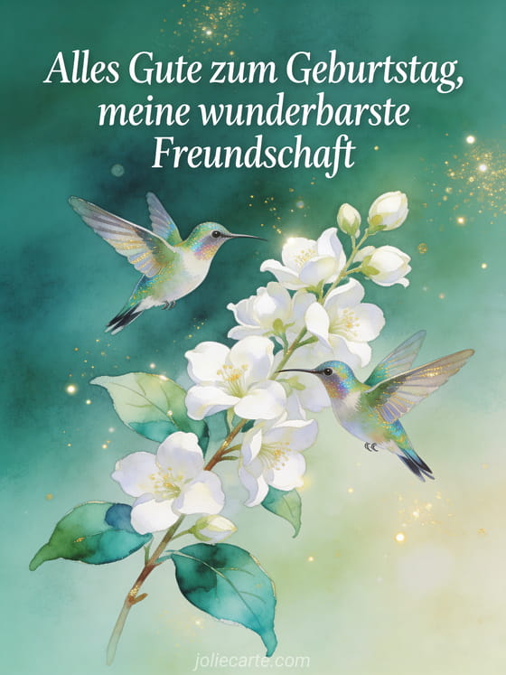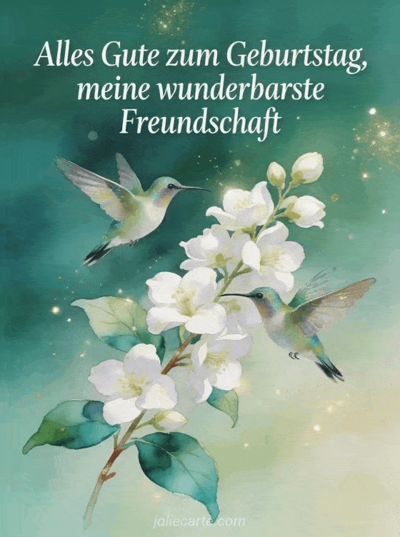 Schicke eine zarte Geburtstagskarte mit zwei schimmernden Kolibris, die um einen blühenden Jasminzweig flattern. Entdecke auch eine gezeichnete Geburtstagskarte für Frauen oder animierte Geburtstags-GIFs für Frauen.