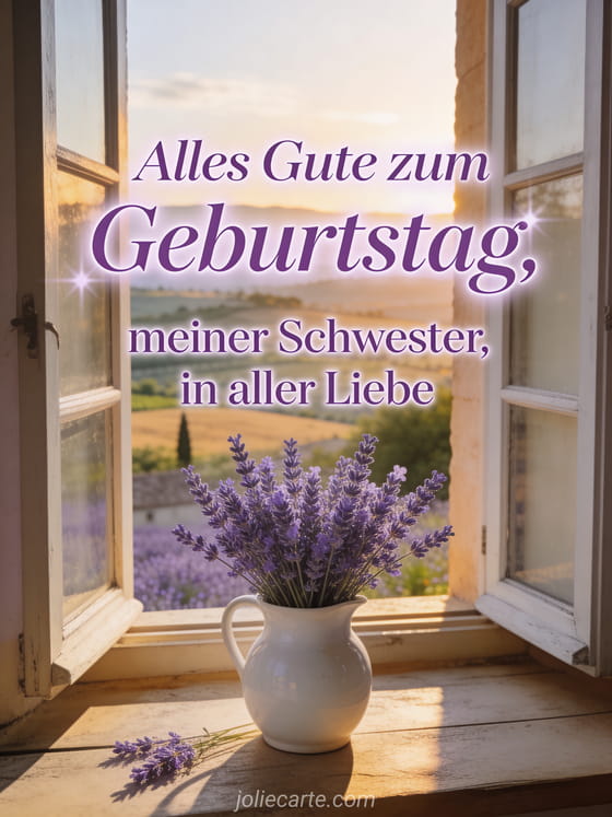 Teile diese fotorealistische Karte für deine Schwester mit Lavendelstrauß, offenem Fenster und ruhiger Sommerlandschaft. Entdecke auch geburtstag meine schwester, Karte alles Gute zum Geburtstag große Schwester und alles gute zum geburtstag meine herzensschwester text.