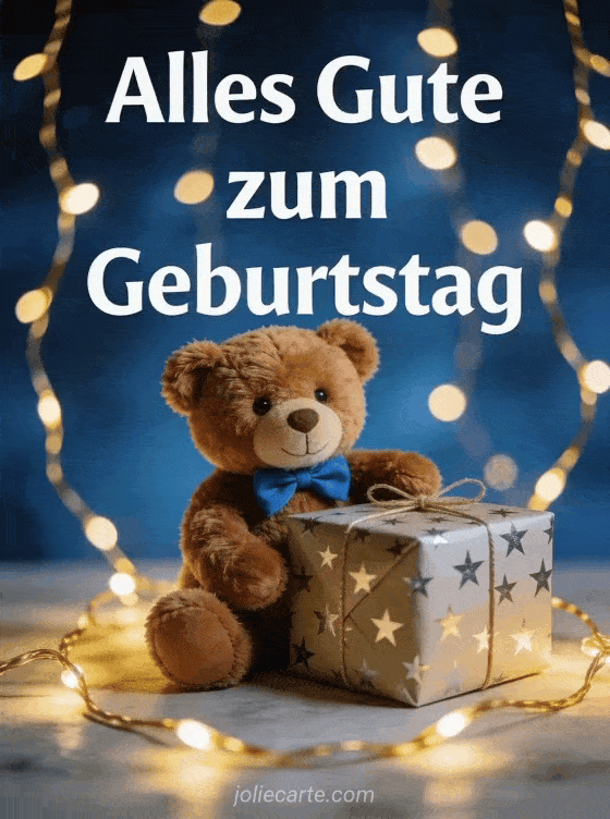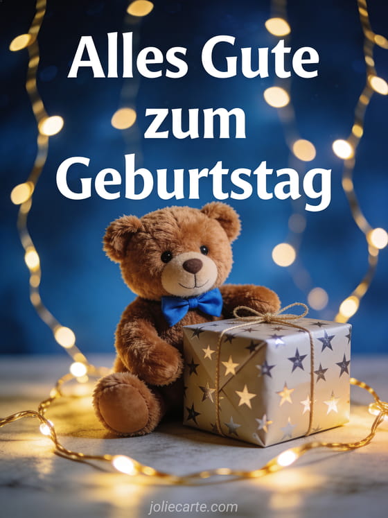 Senden Sie Ihrem Enkel einen magischen Geburtstagsgruß mit einem weichen braunen Teddybär, einer blauen Fliege, einem sternenverpackten Geschenk und goldenen Lichtern. Entdecken Sie auch Lachen ohne Freude, Text zum Geburtstag für meinen Enkel oder Geburtstagswünsche für meinen Enkel.