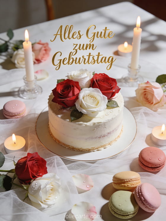 Teile eine stilvolle Geburtstagskarte mit floralem Kuchen, Macarons und warmem Kerzenlicht fur einen besonderen Moment. Entdecke auch Nachricht Geburtstagskarte Frau, schöner Geburtstagstext Frau und gif kostenlos alles gute zum geburtstag frau.