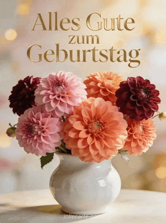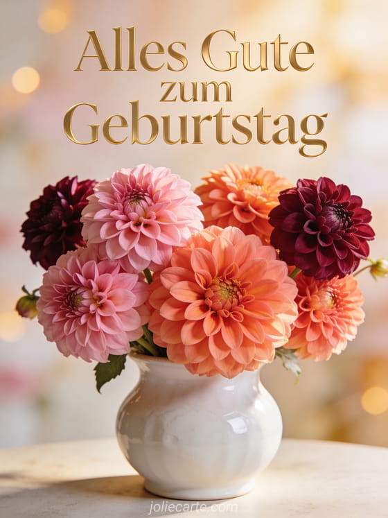 Teile eine stilvolle Geburtstagskarte mit prachtvollen Dahlien und einer warmen, weichen Stimmung. Entdecke auch alles gute zum geburtstag frau bild, geburtstag frau bild und Nachricht Geburtstagskarte Frau.