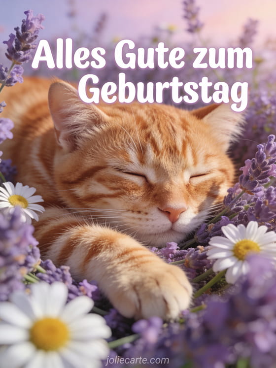 Feiern Sie ihren Geburtstag mit dieser entzückenden Karte, die eine niedliche rote Tigerkatze zeigt, die friedlich in einem Bett aus Lavendel- und Kamillenblüten schläft, mit sanftem und beruhigendem Licht im fotorealistischen Stil. Entdecken Sie auch einen Geburtstag Text Frau oder ein Geburtstag Zitat Frau.