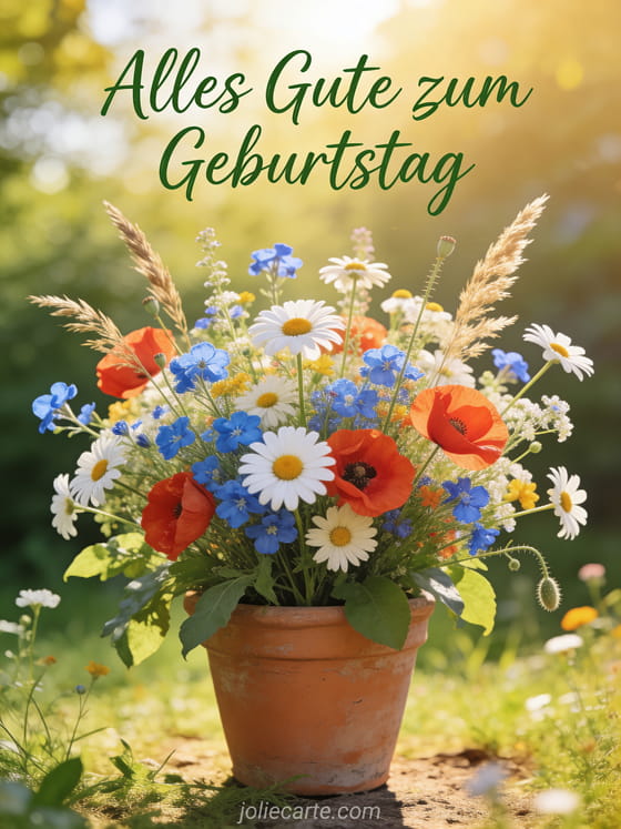Feiern Sie ihren Geburtstag mit dieser charmanten Karte mit einem prächtigen Wildblumenstrauß aus Margeriten, Kornblumen und Mohnblumen in einem Terrakotta-Topf im goldenen Licht. Entdecken Sie auch eine Geburtstagskarte Frau mit Pfingstrosen, einen Geburtstagsstrauß für Frauen oder eine Geburtstagskarte Frau Aquarell.