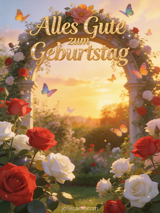 Verschicke dieses wunderschöne animierte Geburtstags-GIF mit einem Rosengarten, bunten Schmetterlingen und goldenem Sonnenuntergangslicht. Eine kostenlose Karte, die jede Frau begeistert. Entdecke auch animierte Glückwunschkarte mit Blumenstrauß oder animiertes Geburtstags-GIF mit Katze kostenlos.