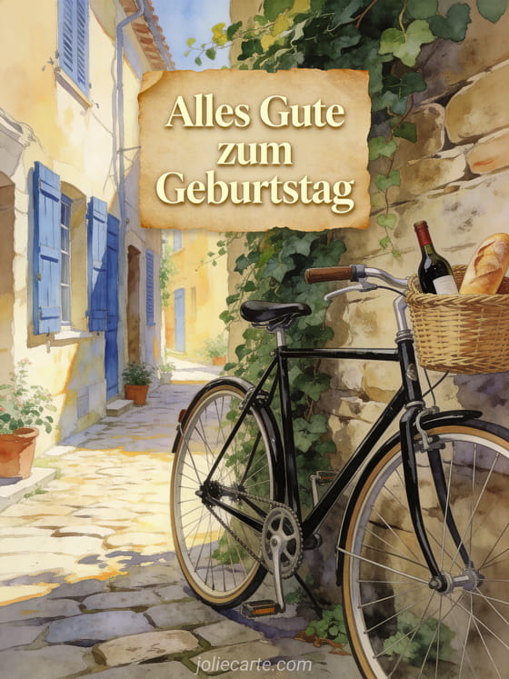 Wünschen Sie ihm alles Gute zum Geburtstag mit dieser charmanten Karte mit einem schwarzen Vintage-Rennrad vor einer efeubedeckten Steinmauer in einer sonnigen provenzalischen Gasse. Entdecken Sie auch Bilder Alles Gute zum Geburtstag Mann, einen Geburtstags-Text Mann mit Humor kostenlos oder eine Geburtstagskarte Mann mit Humor.