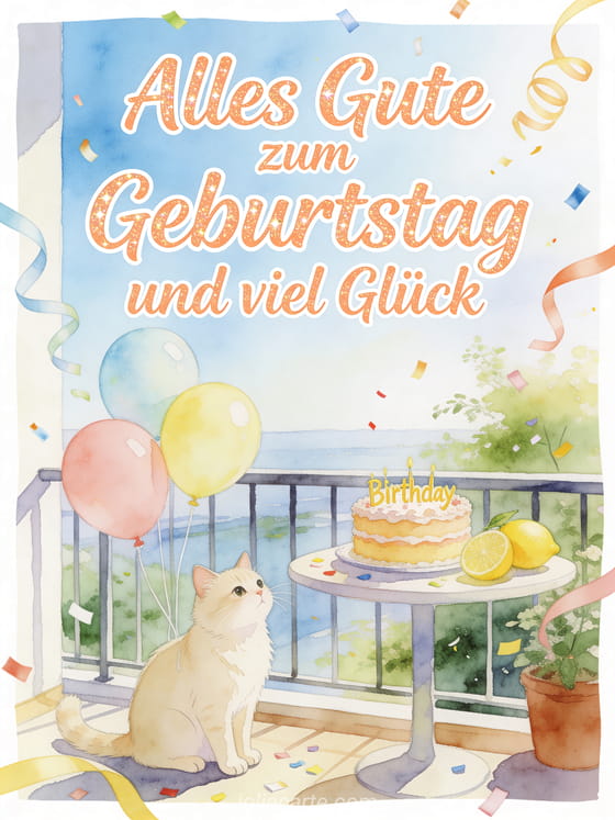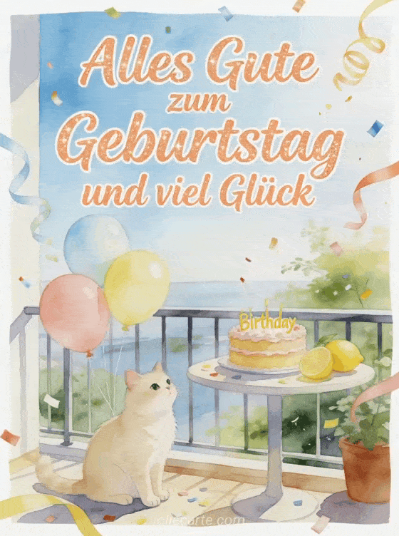 Teile einen frischen Geburtstagsgruß mit apricotfarbener Kalligrafie, einer cremefarbenen Katze, pastellfarbenen Ballons, einem Zitronen-Geburtstagskuchen, geschwungenen Bändern und Konfetti auf einem luftigen Balkon. Sende auch ein Alles Gute zum Geburtstag Mama ich hab dich lieb Bild, ein Geburtstagsbild für Mama oder ein Alles Gute zum Geburtstag Mama animiertes GIF.