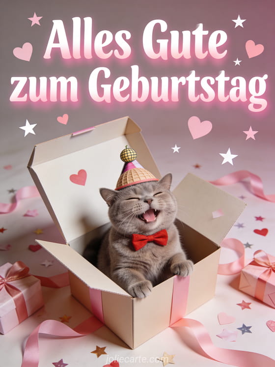 Diese Geburtstagskarte bringt Freude: eine fotorealistische British-Shorthair-Katze mit Hut und Schleife in einer zu kleinen Geschenkbox. Entdecke auch witziges geburtstagsvideo, alles Gute zum Geburtstag animiertes GIF Humor und lustiges geburtstagsvideo.