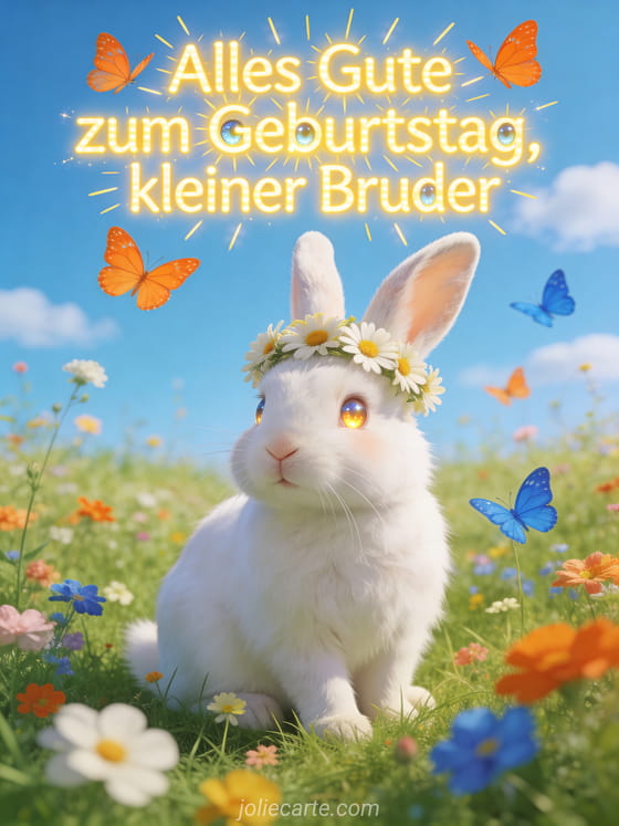 Wünschen Sie Ihrem kleinen Bruder alles Gute zum Geburtstag mit einem niedlichen weißen Hasen mit Margeritenkrone in einer grünen Frühlingswiese mit Wildblumen und Schmetterlingen. Dazu passen eine Geburtstag Bruder Karte, eine Alles Gute zum Geburtstag mein großer Bruder Karte oder eine geburtstag bruder Karte.