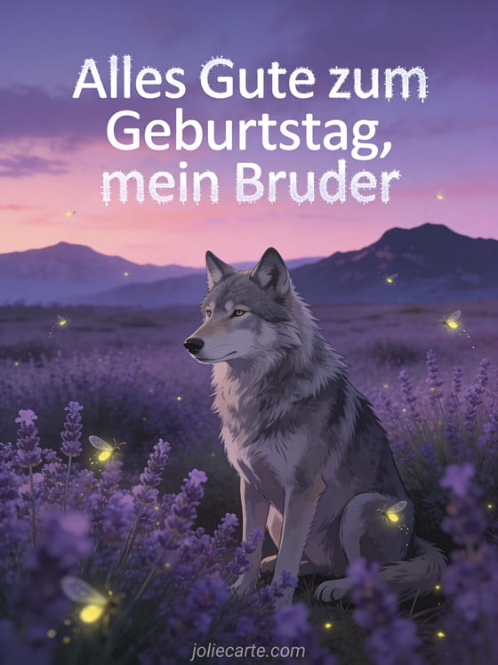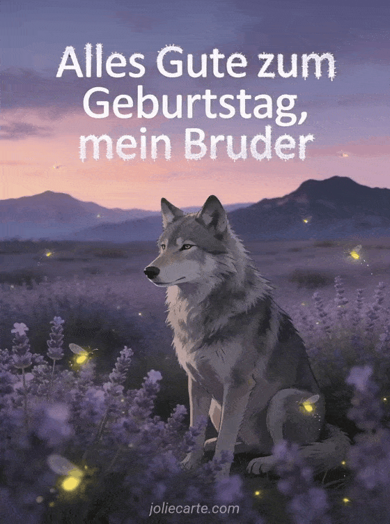 Wünschen Sie Ihrem Bruder einen ruhigen Geburtstag mit einem grauen Wolf in einer blühenden Lavendelwiese unter einem violett-rosa Dämmerungshimmel, mit Glühwürmchen und fernen Bergen. Dazu passen eine Alles Gute zum Geburtstag mein Bruder GIF Karte, eine kleiner Bruder alles Gute zum Geburtstag mein Bruder GIF Karte oder eine Alles Gute zum Geburtstag mein lieber Bruder Karte.