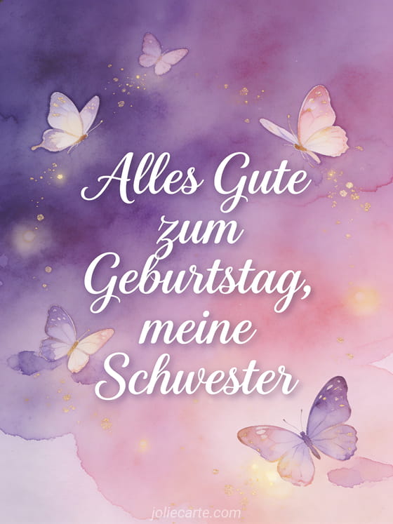 Teile diese poetische Karte für deine Schwester mit zarten Schmetterlingen, violetten Aquarelltönen und goldenem Licht. Entdecke auch Karte alles Gute zum Geburtstag große Schwester, alles gute zum geburtstag meine herzensschwester text und alles gute zum geburtstag große schwester.
