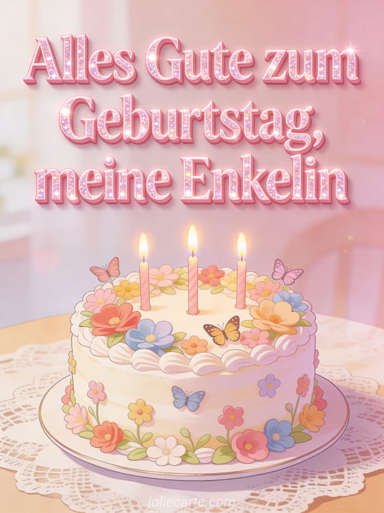 Sende einen zärtlichen Geburtstagsgruß für deine Enkelin mit weicher rosa Glitzerschrift und einem Kuchen, der mit Blumen, Schmetterlingen und Kerzen dekoriert ist. Entdecke auch Geburtstagskarte für meine Enkelin oder Geburtstagskarte Enkelin.