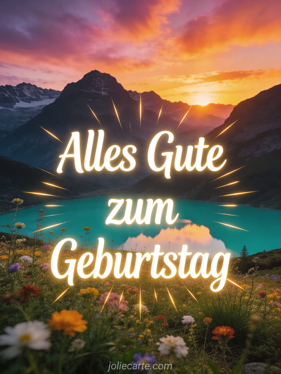 Sende atemberaubende Geburtstagsgrüße mit einer spektakulären Berg- und Seenlandschaft. Leuchtende weiße Buchstaben mit goldenen Strahlen erstrahlen vor einem Sonnenuntergangs-Himmel. Entdecke auch Geburtstagswünsche Mimosenstrauß oder Alles Gute zum Geburtstag herzlich.
