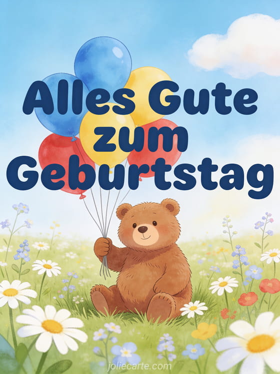 Teile eine warme illustrierte Geburtstagskarte mit einem niedlichen braunen Bären, der bunte Ballons in einer Blumenwiese unter einem sanften blauen Himmel hält. Entdecke auch eine Alles Gute zum Geburtstag mein Sohn Karte, eine lustiges Alles Gute zum Geburtstag mein Sohn Karte oder einen Geburtstagstext für meinen Sohn.