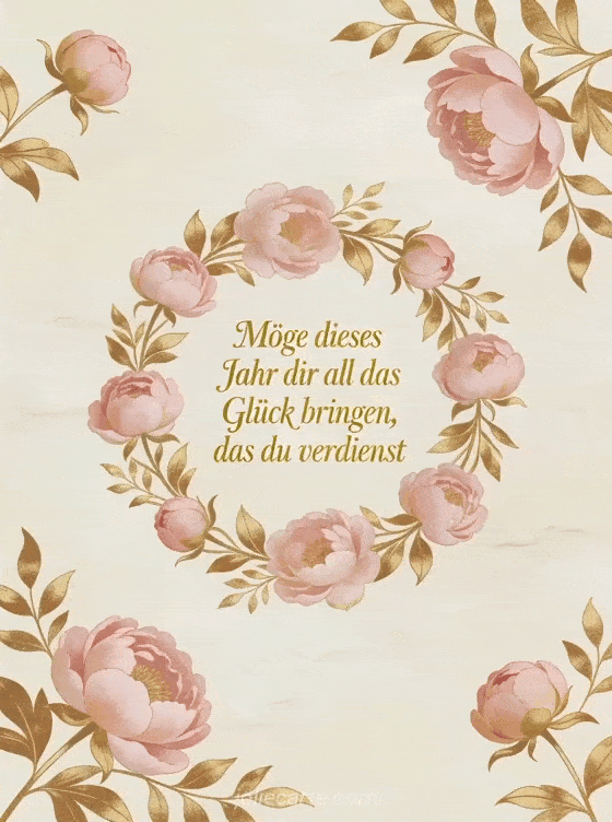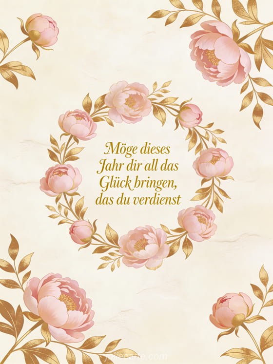 Wünschen Sie ihr alles Gute zum Geburtstag mit dieser zärtlichen Nachricht: "Möge dieses Jahr dir all das Glück bringen, das du verdienst." Diese elegante Karte zeigt zarte Blumengirlanden mit zartrosafarbenen Pfingstrosen und goldenem Laub auf cremefarbenem Hintergrund. Entdecken Sie auch ein Geburtstag Zitat Frau oder Alles Gute zum Geburtstag Frau elegant.