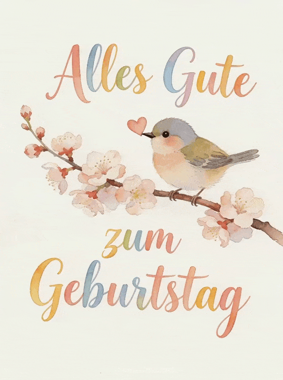 Teilen Sie eine schöne Geburtstagszeichnung mit einem entzückenden Vögelchen auf einem Kirschblütenzweig, das ein kleines Herz in seinem Schnabel hält. Entdecken Sie auch ein lustiges Geburtstags-Gif Frau oder eine virtuelle Geburtstagskarte Frau für weitere Geburtstagsgrüße.