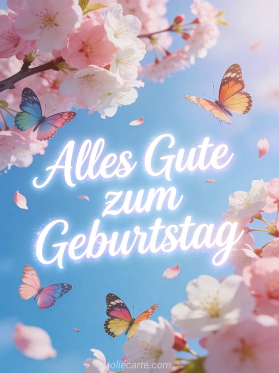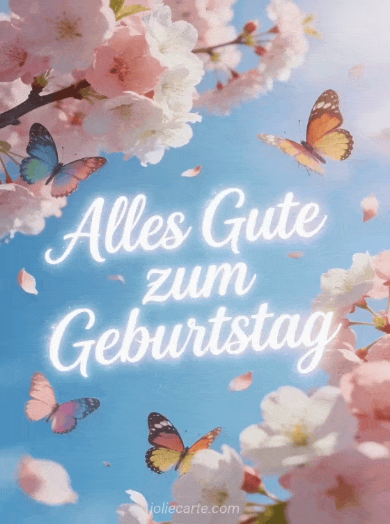 Verschicke dieses zauberhafte Geburtstags-GIF mit bunten Schmetterlingen und Kirschblüten. Eine kostenlose animierte Karte, die jede Frau erfreut. Entdecke auch eine Geburtstagskarte mit Worten für Frauen oder eine Geburtstagsglückwunsch-Nachricht für Frauen.