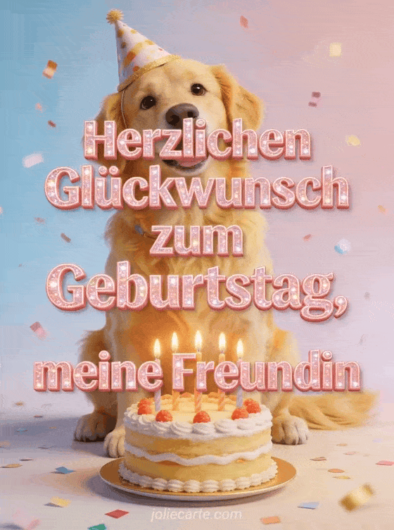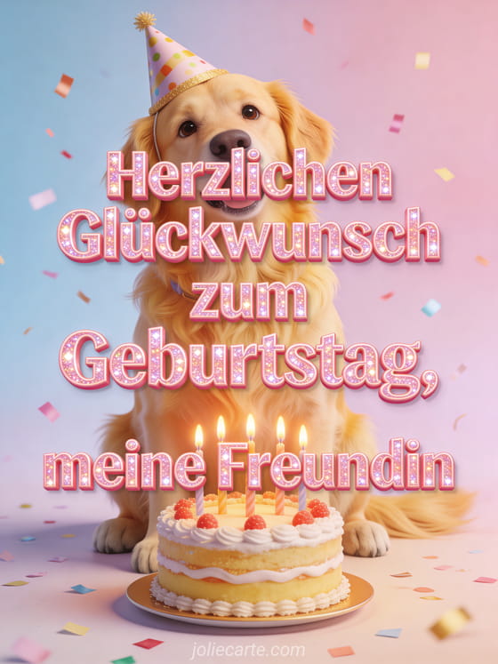 Bring deiner Freundin an ihrem Geburtstag ein Lächeln ins Gesicht mit dieser entzückenden Karte mit einem niedlichen Golden Retriever in Partymütze, der vor einem mit Kerzen dekorierten Kuchen sitzt, umgeben von Konfetti auf einem Pastellhintergrund. Entdecke auch Geburtstagsglückwünsche für eine Freundin oder Geburtstag Freundin wie Schwester.