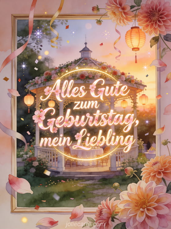 Feiere deinen Liebling mit einer Aquarell-Geburtstagskarte, die einen dahlienbedeckten Pavillon, hängende Laternen, schwebende Bänder und funkelndes Konfetti im warmen Sonnenuntergang zeigt. Personalisiere und sende diesen romantischen Gruß kostenlos online. Entdecke auch ein romantisches Geburtstagskartenbild, romantische Geburtstagskarten oder ein Alles Gute zum Geburtstag mein Liebling GIF.